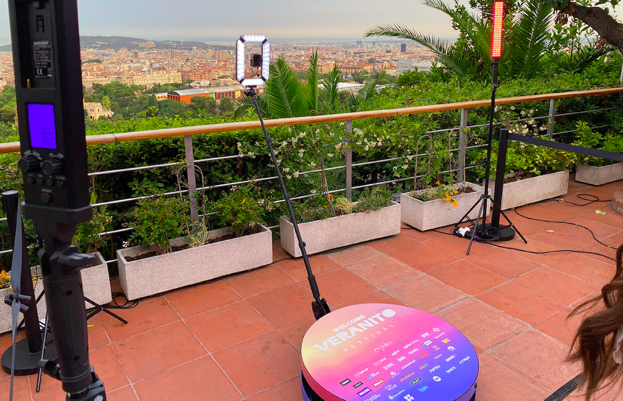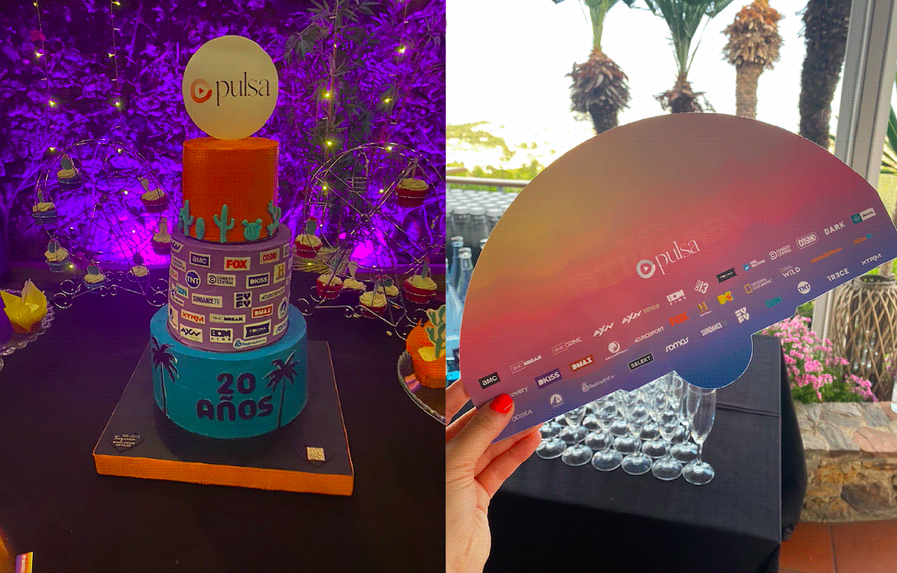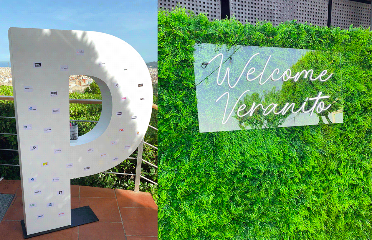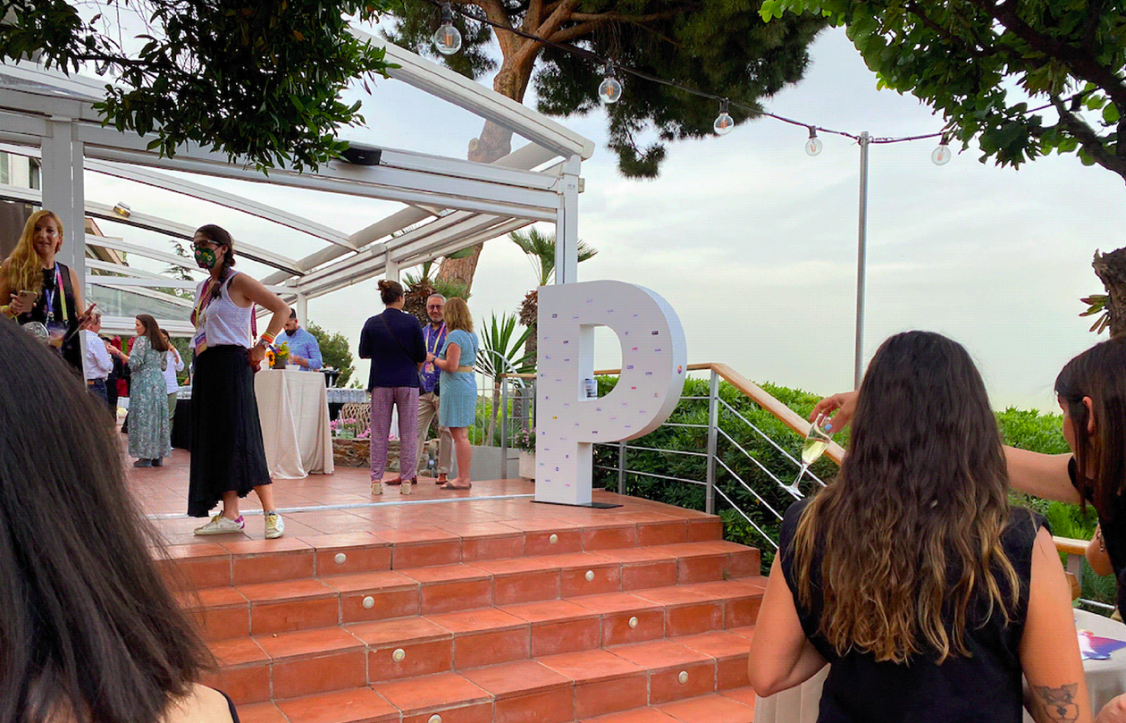 Additionally, we created different stands at the party. These featured a roulette area with promotional merchandise gifts, a space with a custom cake and cupcakes designed according to the event theme, a 360º video area, an installation with a giant «P» where attendees could write messages and greetings, and an eye-catching vertical garden photocall with a customized neon sign.